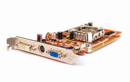 Graphics card connectors. The place to connect the signal cable transmitting the image to the monitor. Light background.