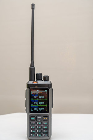 Modern amateur portable handheld transceiver, so-called walkie-talkie or two-way radio on a white background