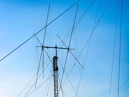 Telecommunication towers of mobile and cellular communication antennas on the background of the sky.
