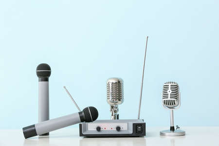 Connecting microphones. Base for microphones with connected red wires. Microphones and radio systems. Musical equipment