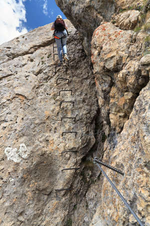 hiker in Col Rodellal Via ferrata, Italian Dolomites