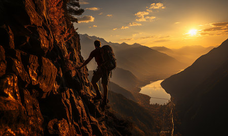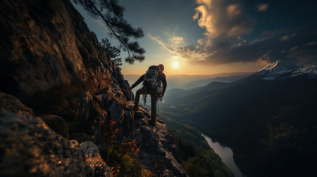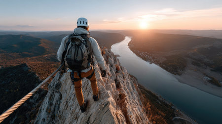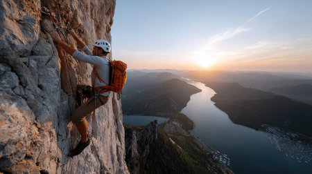 A determined rock climber ascends a dramatic cliff face at sunset, capturing the essence of adventure and athletic spirit against a breathtaking river valley backdrop.