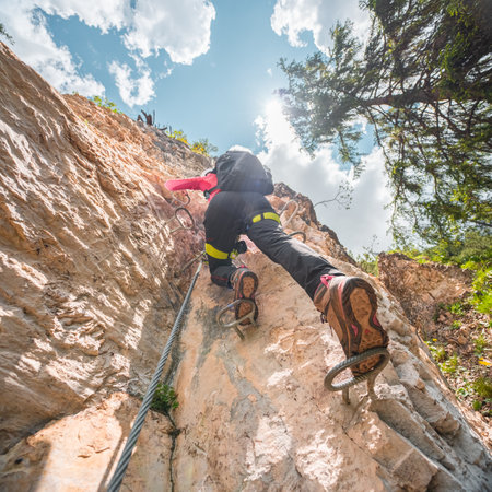 Climber Climbing Up a Steep Stone Wall Along a Via Ferrata Path