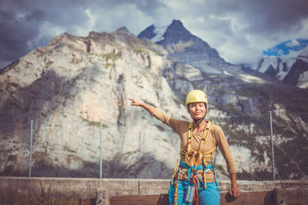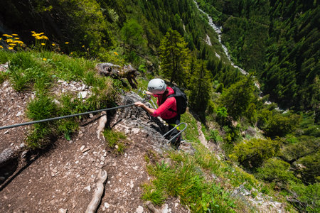 Pretty, female climber on a via ferrata - climbing on a rock in Swiss Alps