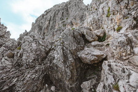 Bottom Up View of a Steep Via Ferrata Stone Wall Along a Climbing Path with Steel Wire and Steps