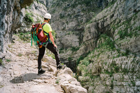climber with a backpack and a helmet goes along a mountain path in the mountains. Girl climber in the mountains. adventure and mountaineering concept. hiking with a backpack in the mountains.