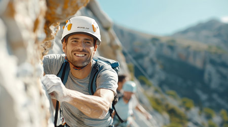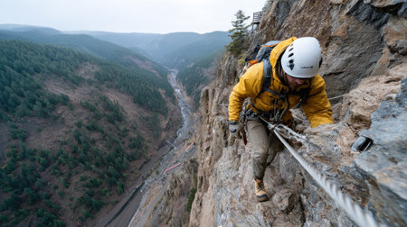 A dedicated climber making an impressive ascent along a steep cliff, showcasing the thrill of outdoor adventure against a stunning mountain valley backdrop.
