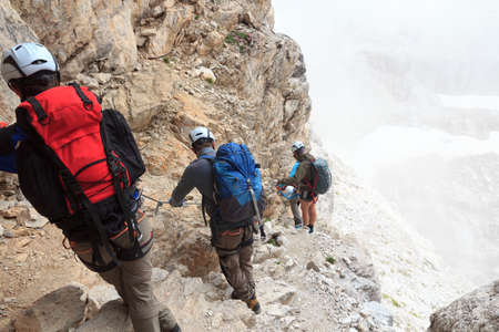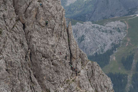 The view of a group of people climbing mountain, mountaineering in Dolomites, Italian Alps.