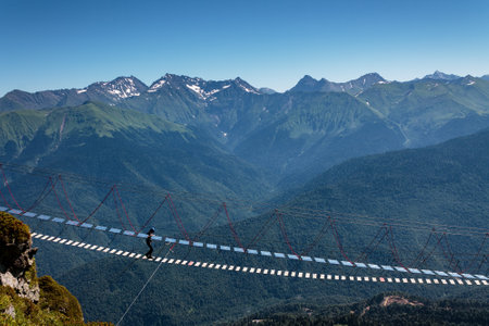 Sochi, Russia, 17 September 2020 - a young fearless woman walks on a rope bridge over a precipice high in the mountains