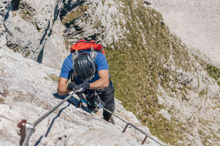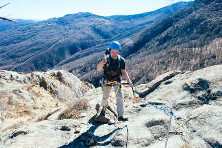 mountaineer as he climbs mountain, along a via ferrata in the autumn