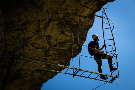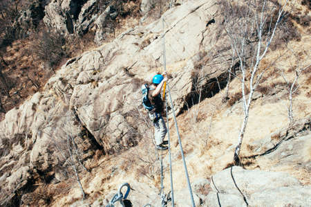 Woman in helmet and special equipment climbing high mountain via ferrata. Crimea.