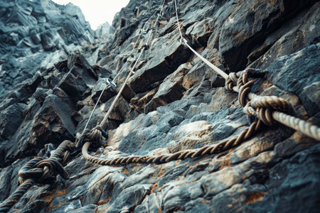 Rope Attached to Side of Mountain, A network of ropes and anchors snakes its way up the cliff, a testament to the teamwork and preparation required for a successful ascent
