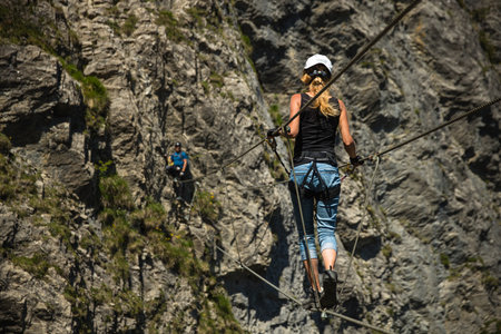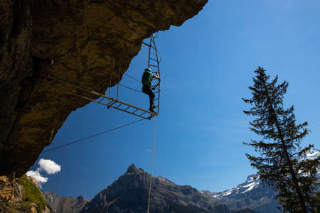 Kandersteg - amazing vacation destination in the Swiss Alps, Switzerland. Couple on a lovely via ferrata