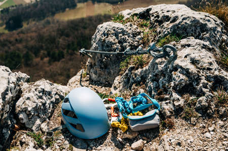 Ferrata climbing equipment. Via Ferrata set with two lanyards with carabiners, helmet with the steel cable in the background. Gear on the cliff at the top of the mountain.