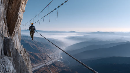 A daring adventurer crosses a high cable stretching over a stunning mountain range at dawn, with fog rolling over the valley below, creating a mesmerizing landscape.