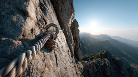 This image captures a close-up view of a climbing anchor securely fastened to a rocky mountain face, with a stunning sunset illuminating the landscape.