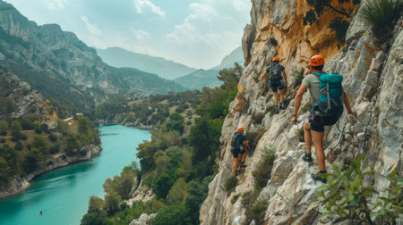 Thrilling Adventure of Rock Climbing Duo Above Picturesque Turquoise River in Rugged Canyon Landscape AI Generative
