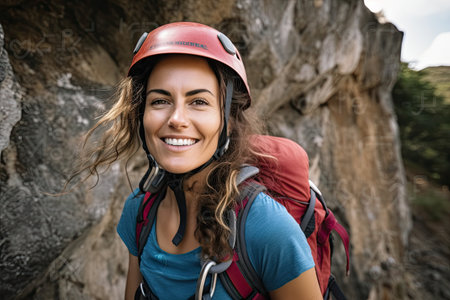 Portrait of a smiling female climber looking at camera while standing on a cliff
