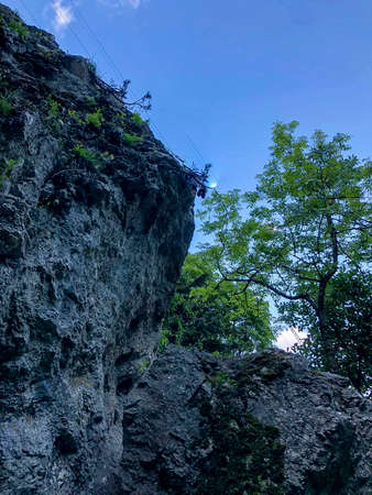 The climber climbs on a rocky wall in the forest. Extreme sports.