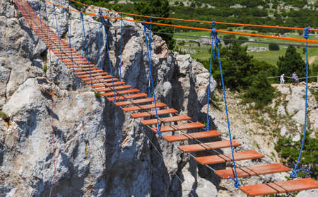 Attraction suspension bridge in the mountains with a cliff in the gorge