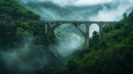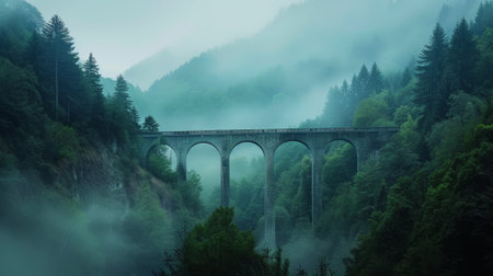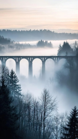 An arched stone bridge is the central subject of the composition, elevated above a dense, misty valley. The scene presents a soft color palette with hues of blue, grey and muted greens. Tall trees emerge from the fog. The image suggests natural beauty and offers possibilities for various commercial and editorial applications.