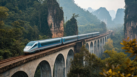 A high-speed train gracefully travels through a stunning landscape, crossing an elegant bridge surrounded by lush greenery and dramatic mountains. Perfect for themes of travel and modern transportation.