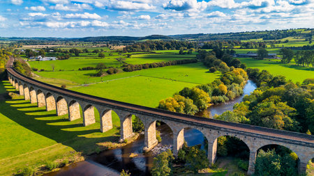 An old stone bridge with a vintage steam train crossing over, surrounded by a lush landscape. This scene captures the essence of historic transportation.