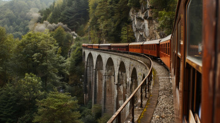 A stunning train travels through beautiful landscapes, showcasing a viaduct that curves gracefully across hills and valleys. Perfect for travel and nature themes.