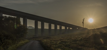 Large highway viaduct with foggy sunrise on autumn