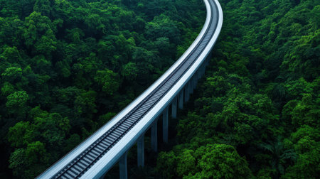 A curved train track runs through a lush green forest, showcasing a blend of nature and infrastructure.