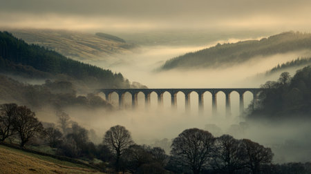 A stunning view of a stone viaduct emerging from thick fog, nestled in lush green valleys bordered by hills and trees, creating a tranquil, serene atmosphere.