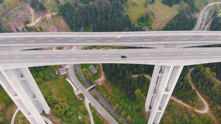Aerial view of the Highway Viaduct on Concrete Pillars with Traffic in Mountains