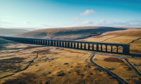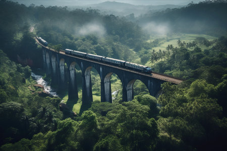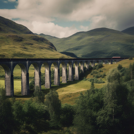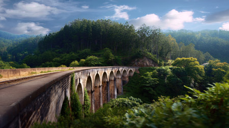 A picturesque railway bridge spans across a verdant landscape, surrounded by lush hills and a clear blue sky, capturing the beauty of nature and adventure.