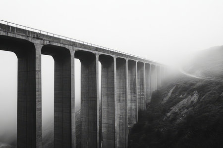 A curving road leads across a stone viaduct disappearing into the mist.