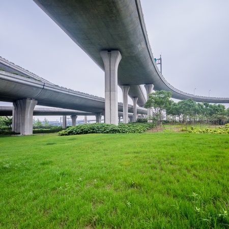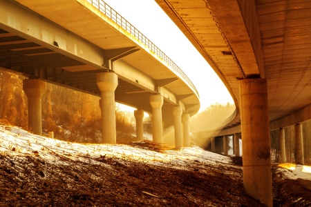 Highway overpass in Kazan, Russia, under view of the concrete pillars. The concept of urbanization.