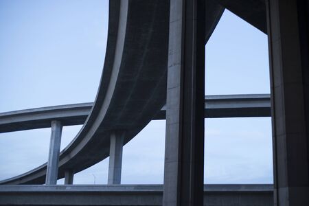 An overhead view reveals a complex highway interchange with multiple lanes and elevated roadways. The scene presents a network of curved concrete structures with vehicles traveling in various directions. The composition suggests a metropolitan setting with a focus on transportation and infrastructure, suitable for editorial and commercial applications.