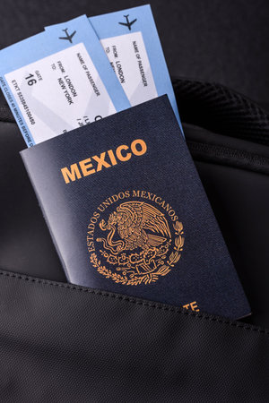 Passport Mexico, visa for travel, document with tickets in travel bag. Mexican passport as background for your design