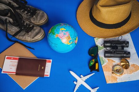 Top view photo of traveling concept with accessories and world symbols over blue background