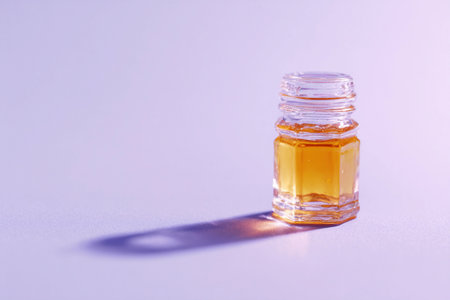 The image features a single small glass vial standing upright on a reflective surface. The vial is partially filled with a clear liquid and has a black cap. The background is a gradient of soft, warm tones, likely created by sunlight filtering through a window.