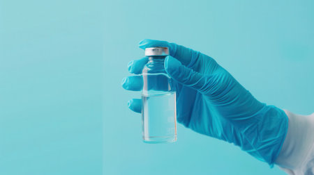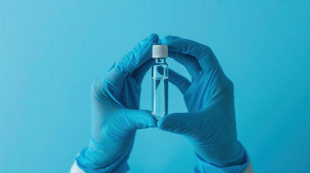 A pair of hands, protected by blue gloves, carefully hold a transparent vial filled with liquid, highlighting precautions in healthcare.