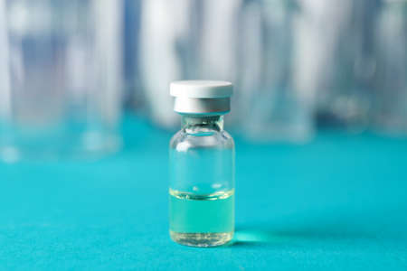 Glass vials with vaccine liquid on a blue background. The concept of medicine, vaccination and injection.