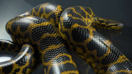 Close up photo of yellow anaconda on dark