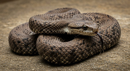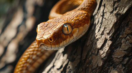 Close-Up Portrait of Coiled Snake, Scales Glistening Under Warm Light, Reptile Photography