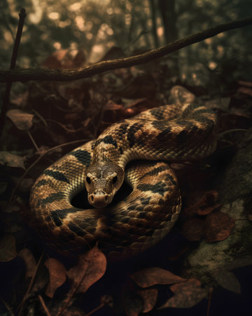 Snake coiled among leaves in a forested area during the afternoon, showcasing intricate patterns and vibrant colors