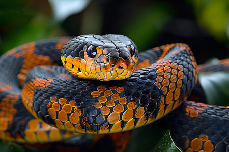 Colorful snake python cobra viper forest hiding waiting for prey rainforest jungle untouched nature predator venomous venom dangerous wildlife poisonous animal skin tail creepy african exotic species