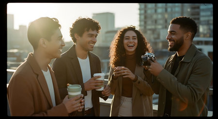 Four friends laughing and holding drinks on a rooftop during sunset with city skyline in the background.