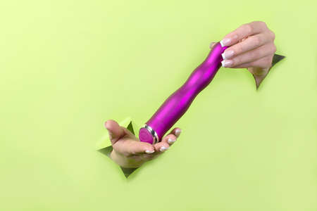 Female hands holding sex toys on a green background. Sex shop concept.
