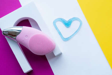 Modern face cleansing brush on bright background. Cosmetic accessory.Beauty and skincare concept. Brush for face lifting, anti-aging wrinkles and massage