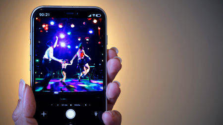Smartphone screen framing energetic dancers moving under colorful stage lights during electrifying live performance