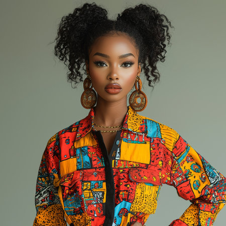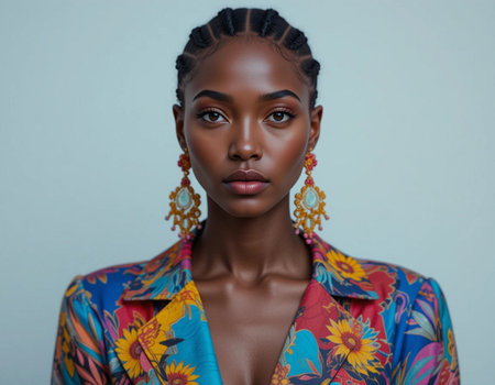 Elegant fashion portrait of a confident young woman in vibrant, bold colors, radiating charisma. The intricate patterns of her outfit, combined with striking accessories, make this image an inspiration for vibrant style.